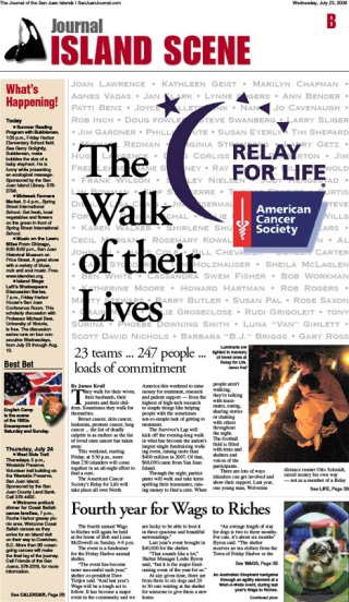 The Survivors Lap will kick off the evening-long walk in what has become the nation’s largest single fundraising walking event, raising more than $400 million in 2007. Of that, $68,000 came from San Juan Island.