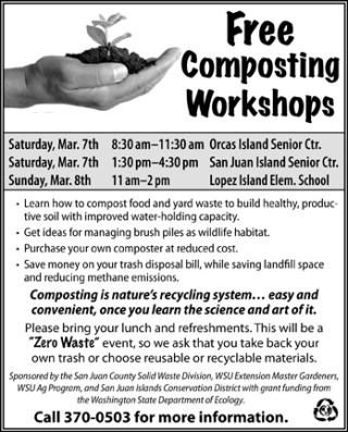 The workshops are sponsored by the San Juan County Solid Waste Division, WSU Extension Master Gardeners, WSU Ag Program, and San Juan Islands Conservation District with grant funding from the state Department of Ecology.
