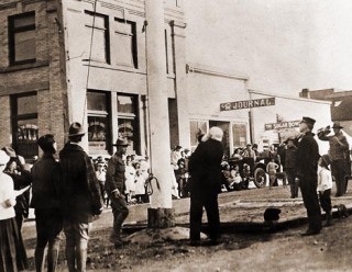 On Memorial Day, May thirtieth, the new flagpole was dedicated and the new flag raised. The day seemed more like the Fourth of July than any other day of the year. A holiday crowd thronged the village, but the prevailing spirit was a somber patriotism rather than joyful celebration. Mother and Father stood on the bank building steps with the two little girls, but my brothers and I crowded toward the center of the intersection.