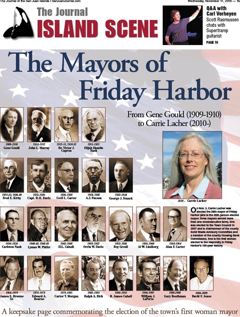 A SanJuanJournal.com slideshow pays tribute to the mayors of Friday Harbor — from Gene Gould (1909-10) to Carrie Lacher (2010-). The video was produced by Journal multimedia reporter Jane K. Fox, with music — “Leaving Friday Harbor” — courtesy Battlefield Band. Thank you to the Town of Friday Harbor and Town Clerk Amy Taylor for the images.