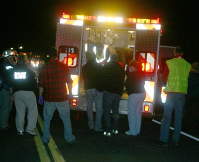Emergency medical personnel load a 19-year-old woman into an ambulance for transport to the airport