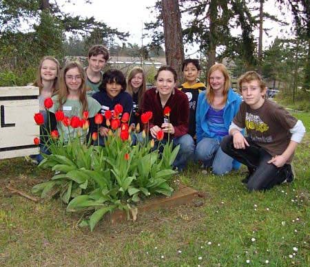 The team posed for a photo outside Friday Harbor Elementary School on April 14. The bright red tulips blooming around the sign are the fruits of “Plant the Promise,” a commemoration of Red Ribbon Week in October. The bulbs were planted in 2006 and 2007 by fifth-grade students at Friday Harbor Elementary School in cooperation with the San Juan Island Prevention Coalition, the Family Resource Center, and MarketPlace.