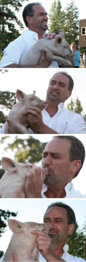 — How: The pig kisser vote tickets will have been sold, votes counted, and the pig kissers will be waiting for the results. The “winner” (some prize!) will be announced, and the cute and unsuspecting pig will be kissed.