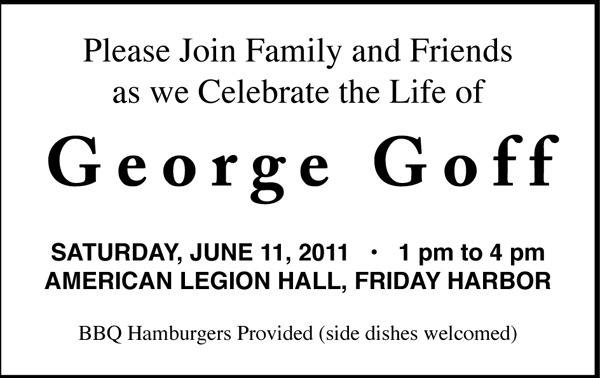 Join family and friends in celebrating the life for George Goff, June 11, at the American Legion Hall in Friday Harbor, 1 p.m. to 4 p.m.