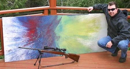 What’s it look like when containers full of colored paint are pierced by a .222 caliber bullet traveling at warp speed and then explode strategically onto a canvas?