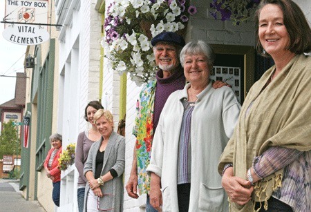Heading uphill from Herb’s Tavern: “9,” a gallery for Northwest island art and gifts, opened on the Fourth of July by architect/artist Nina Pellar LeBaron; Momentum Handbag, opened two weeks ago as a workshop/studio by leatherworker Winnie Brumsickle; Dan Levin Originals, where Levin and Diane Levin create fine jewelry “known and sold all over the world” and Vital Elements, a two-year-old mixed-media craft supply shop which is also a workshop and studio for owner Rhonda Scott’s Retro Rose Design.