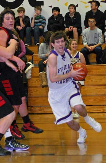 Friday Harbor's Dylan Demaris drives baseline for two in the Wolverines 68-27 runaway win at home