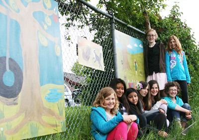 Students of Spring Street International School's middle school art class pose for a picture beside several of the murals that decorate the green space by the Brickworks plaza.
