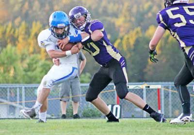 Friday Harbor senior Gabe Lawson (No. 10) wraps Vikings running back Pasha Bullock for no gain in the Wolverines 57-19 win at home