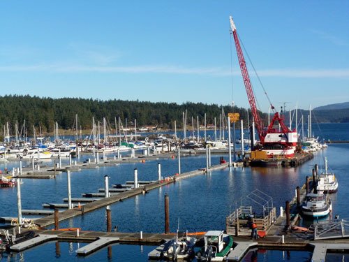 In October 2014 Manson Construction mobilized into the marina with their huge crane and got to work removing old creosote pilings and wooden floats throughout the marina. The Harbormaster relocated vessels to accommodate the major renovations and no vessels were turned away for guest moorage during the holidays.