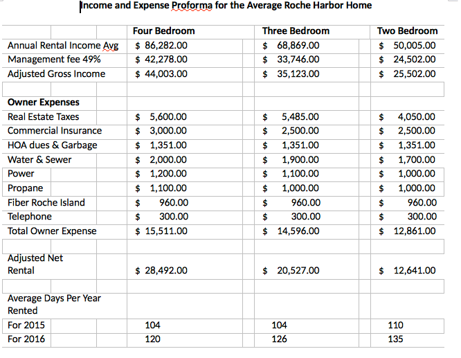 Below is an outline of the income and expense proforma for each type of home in the rental pool. Roche Harbor charges a 49 percent management fee as the homes are operated very similar to a hotel. Utilities are similar to any other home on the north end, but if the home is in the rental pool, as in the case of any vacation rental, commercial insurance is required, which is more expensive.
