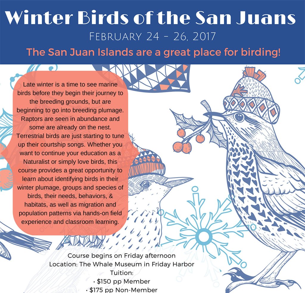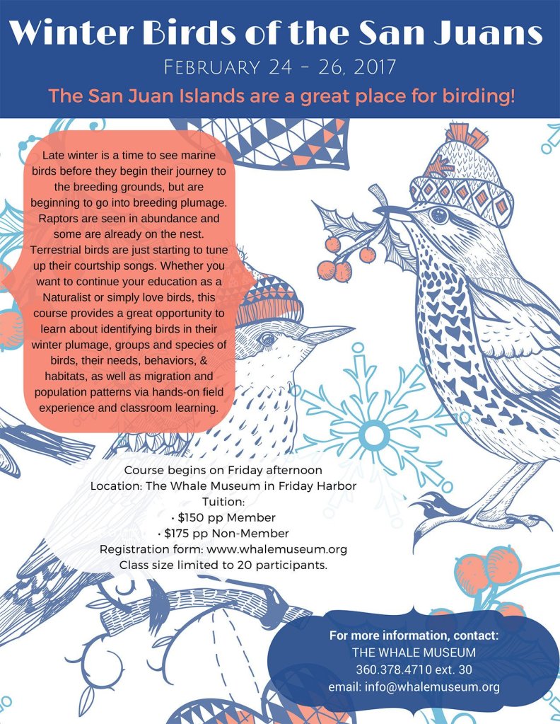 The Whale Museum is holding a “Winter Birds of the San Juan Islands” workshop in partnership with San Juan Islands Audubon. Taking place the weekend of February 24-26, the intent is to increase our birding skills through field trips and presentations.