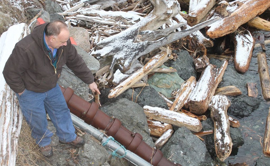 OPALCO Systems Engineer Joel Mietzner looked down the bank off Pear Point Road on San Juan Island on Feb. 3. He pointed to a pipe encasing an OPALCO submarine power cable and a CenturyLink fiber optic cable, as well as rope and wire attaching the two, outside the culvert.
