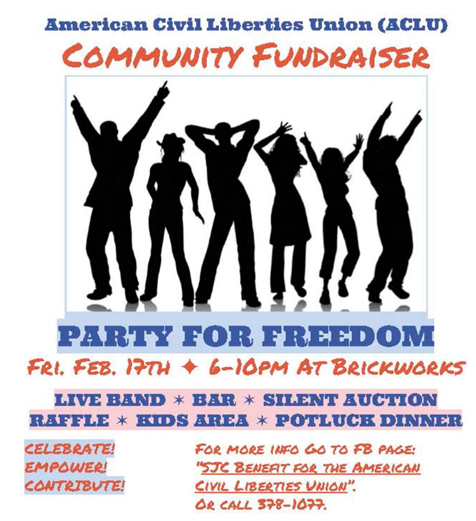 The American Civil Liberties Union fundraiser, Party for Freedom is 6-10 p.m., Friday, Feb. 17 at Brickworks. There will be a live band, bar, silent auction, raffle, kids’ area and potluck dinner. Donations for the silent auction can be delivered to Meat Machin Cycles on Web Street. Suggested donation of $10. For info search “SJC Benefit for the American Civil Liberties Union” on Facebook or call 378-1077.