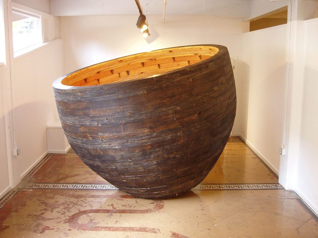 From the ceiling of the museum’s Atrium, Aaron Haba’s “A Reflection of Vessel,” a massive wooden bowl weighing 2,500 pounds, will be suspended with what Haba calls a new twist to the installation.