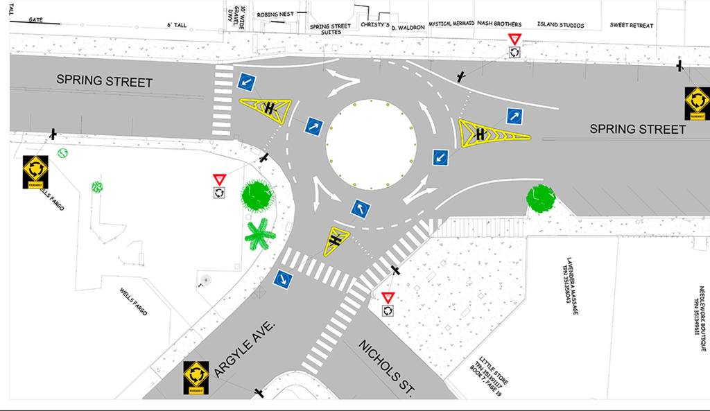 The conceptual design for the project can be found here. Other drawings and mock signage will be put on public display at town hall. Changes to the Argyle Avenue and Spring Street intersection would include: