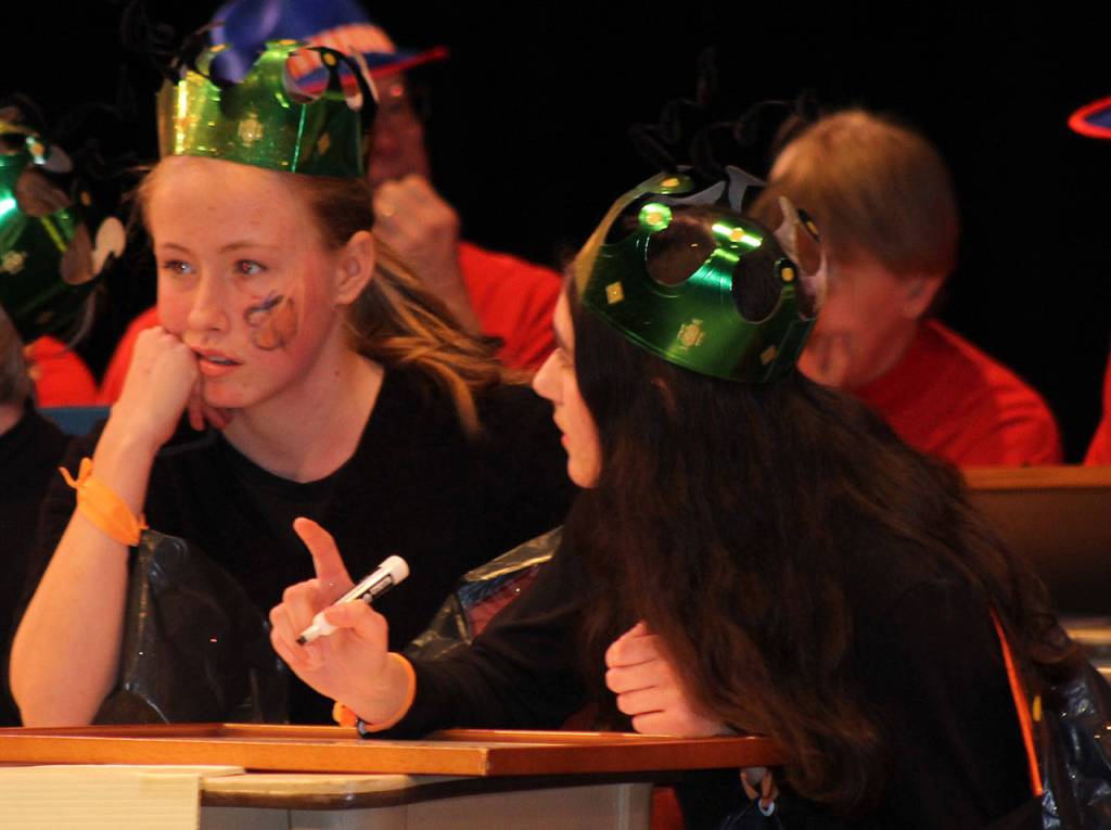 A second round brought questions worth two points each. Tabulated with sharpies on paper easels, scores put the 11th and 12th graders in the lead with 45, followed by a tie with 35 between the Rotary and Soroptimist clubs.