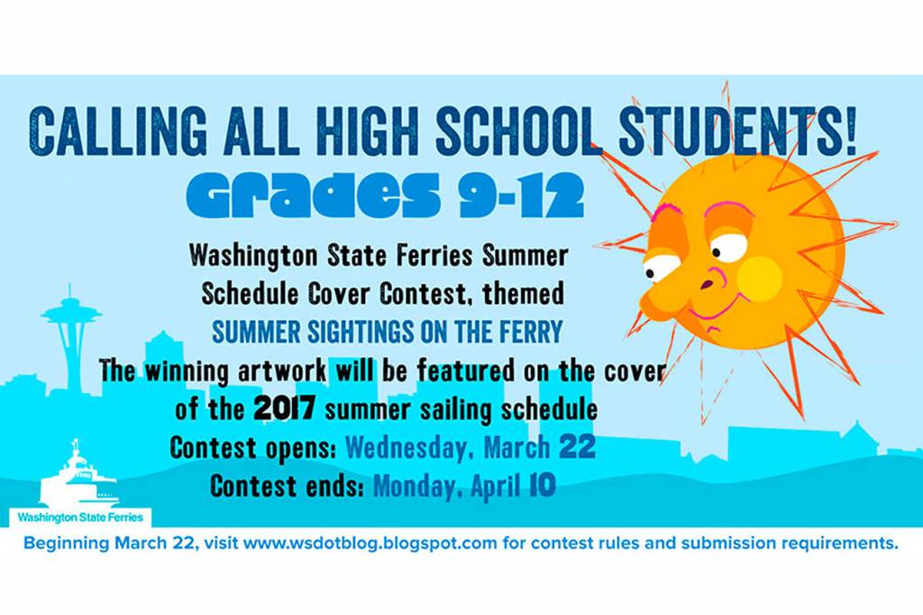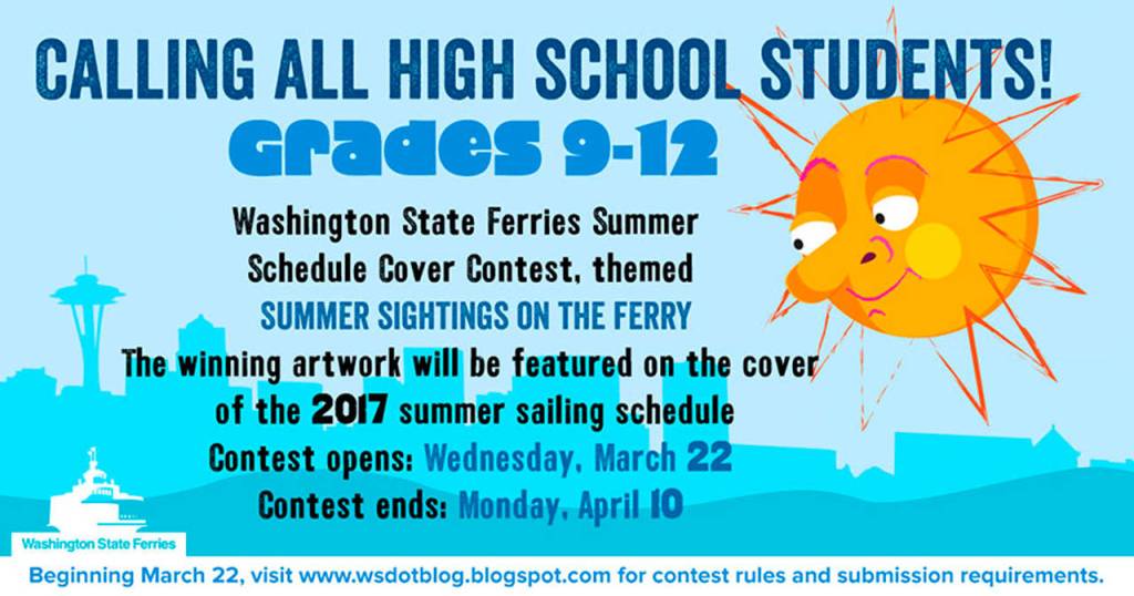 Calling all high school students. Washington State Ferries is looking for a sunny new design for its summer 2017 sailing schedule. High schoolers are invited to send their best drawing of what “Summer sightings on the ferry” means to them.