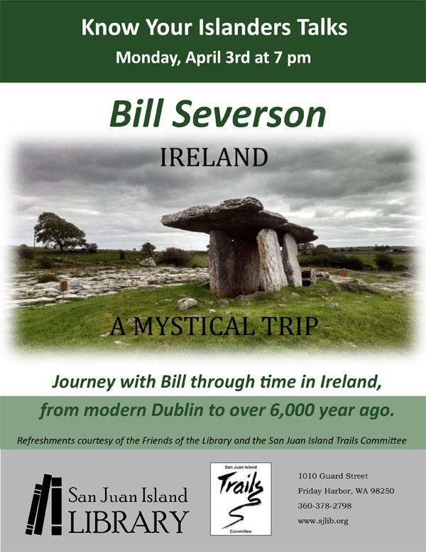 Bill Severson will relive his trip through Ireland’s ages, with Laura Jo, on Monday, April 3 at the San Juan Island Library. In this free event, Bill will discuss Ireland, from modern Dublin to over 6,000 years ago.