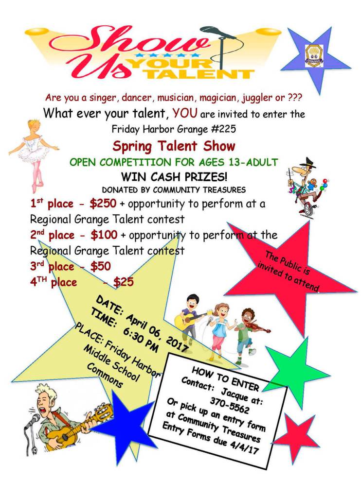 Are you a singer, dancer, musician, magician or juggler? Whatever your talent, you are invited to enter the Friday Harbor Grange No. 225 Spring Talent Show at 6:30 p.m., April 6 at the Friday Harbor Middle School commons. The show is an open competition for ages 13 through adults. To enter, contact Jacque at 370-5562 or pick up an entry form at Community Treasures and return it by April 4. The public is invited to watch.
