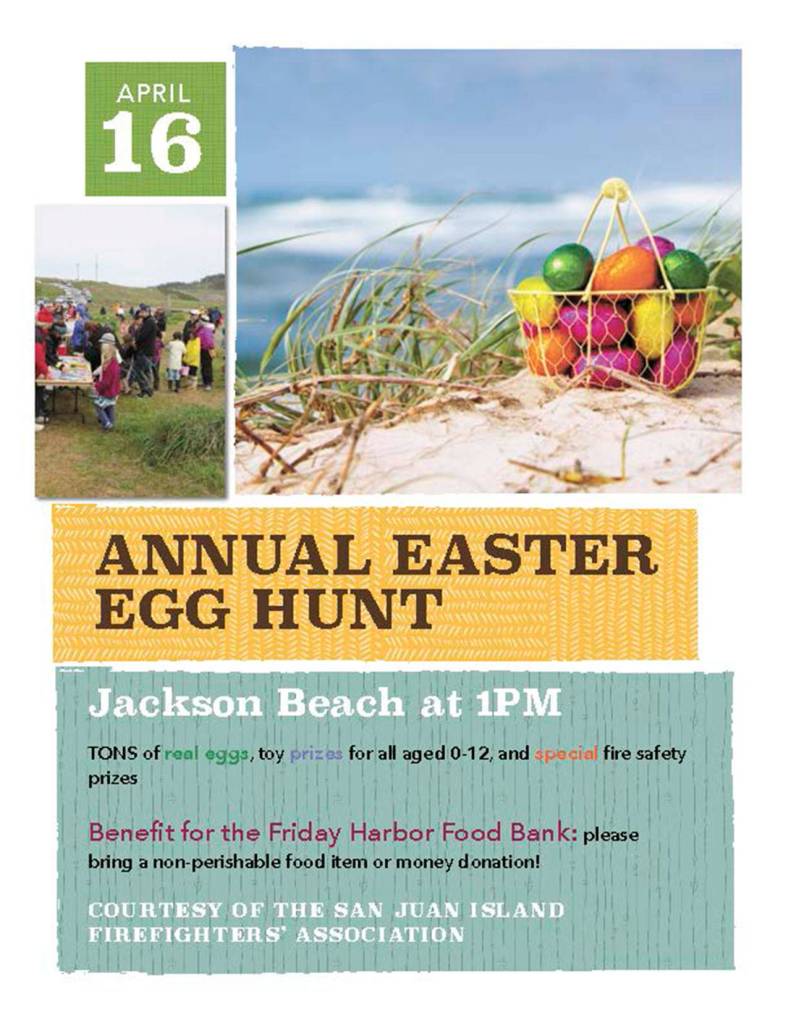 The San Juan Island Firefighters’ Association’s annual easter egg hunt is at 1 p.m., Easter Sunday, April 16 at Jackson Beach. There will be tons of real eggs and toy prizes for ages under 12, as well as fire safety prizes. The event benefits the Friday Harbor Food Bank. Please bring a non-perishable food item or money donation.
