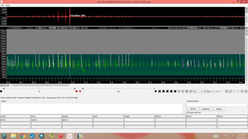 Bats echolocate when flying to navigate, as well as locate potential prey, like flying moths. Echolocation chirps are repetitive, complex sounds, with species-specific characteristics like the songs of birds that can be used to identify species. Special software is used to process the hundreds to thousands of chirps recorded each night, resolving them to separate flyovers or passes (like the rising and falling sound of a passing airplane) and identify them to species based on a library of verified recordings.