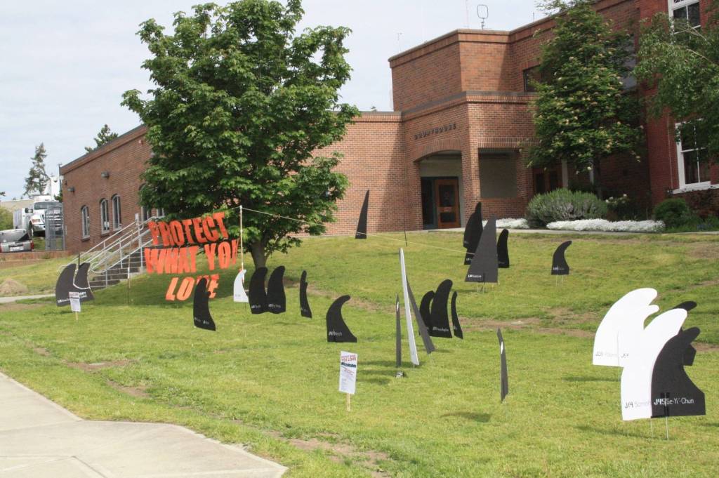 Members of the Center for Whale Research and the San Juan Islanders for Safe Shipping planted 86 foam orca fins on the county courthouse and council chamber’s lawns to honor Endangered Species Day. The seven white orcas represented the ghosts of those who died in 2016 and early 2017 and a chain draped around Tokitae’s fin represented her captivity at a Miami oceanarium. Of the over 1,000 animal types on the Endangered Species list, the Salish Sea’s resident orcas have made it to the top eight. According to Deborah Giles, research director at the Center for Whale Research, that was a way for the National Oceanic and Atmospheric Administration employees to request congressional funds to protect what they consider to be the most endangered species. So far, no money has been allocated.