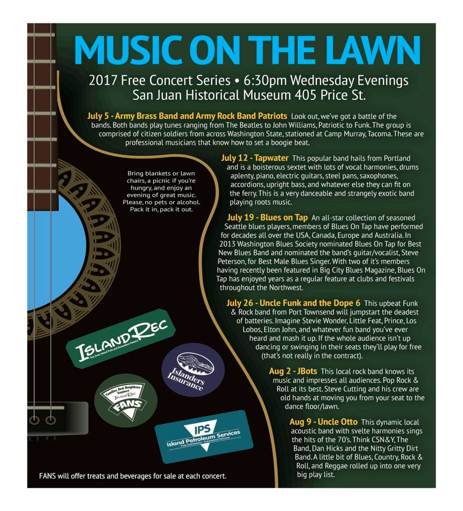 Island Rec’s long-standing concert series Music on the Lawn returns on Wednesday nights from 6:30-8:15 p.m., at the San Juan Historical Museum, at 405 Price Street. Grab a blanket or bring a chair, have a picnic and get ready to dance.