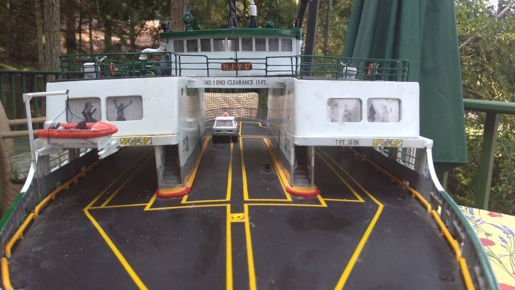 The Hiyu model Fred built is just like the original, now-decommissioned Washington State Ferry, expect built to a 1/64 inch scale. Instead of 162-feet long, it’s about 30 inches. Instead of steel, the majority of the structure is plastic.