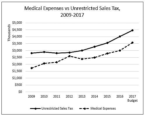 To visualize the question, I graphed the county’s unrestricted sales tax revenue against the county’s cost for medical insurance, including dental insurance and HSA (Health Savings Accounts) contributions. Both have grown substantially in the past eight years. Sales tax is higher – that is, we bring in more in unrestricted sales tax revenue than we pay out for medical insurance – but the growth trends are similar. Sales tax has grown more steadily, following a recession-related decline. Medical costs have grown more erratically, with a marked drop in 2013, when the county changed medical plans to save money. Despite the change, medical insurance costs have grown 107 percent from 2009 to 2017, compared to 59 percent for sales tax. As a result, the gap between the two has lessened – from about $1.1 million to about $.9 million. Medical costs used to equal 61 percent of local option sales tax; they are now 79 percent. If these trends continue, it won’t be long before the County’s local option sales tax – its only unrestricted sales tax revenue – is paying for nothing but medical insurance for its employees.