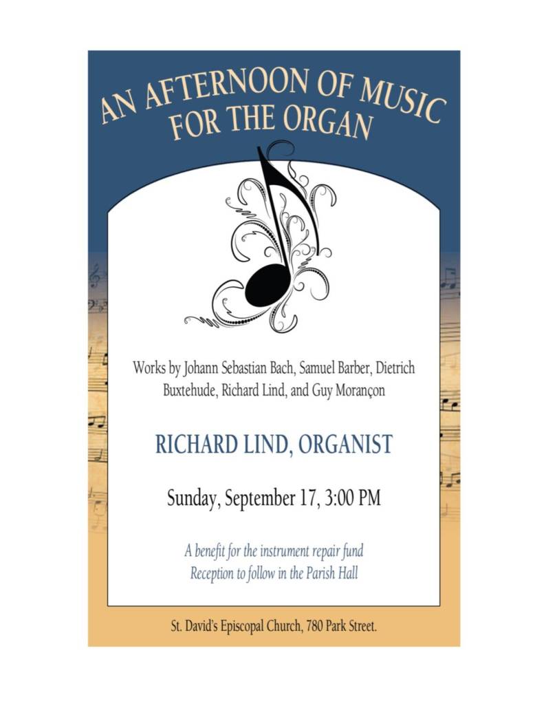 There is no charge to attend, but donations will be accepted to be used for instrument maintenance at St. David’s. A reception will follow in the undercroft. Detailed information can be found on the St. David’s website: www.stdavidsepiscopal.org