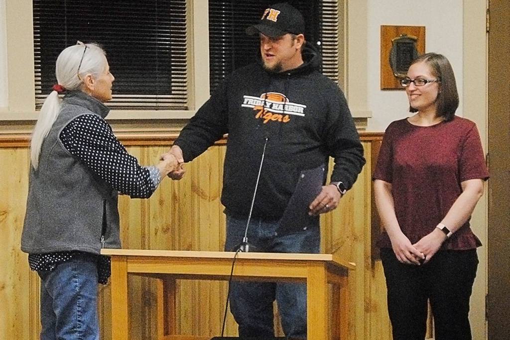 Friday Harbor’s youth football team, the Tigers, was recognized for their success at the town council meeting on Thursday, Dec. 7. The Mayor of Friday Harbor, Carrie Lacher, proclaimed that Saturday, Dec. 9 be Tigers Football Day. Lacher presented an official proclamation document, with the Seal of the Town of Friday Harbor, to Kasey Anderson, Tiger board vice president and junior Tiger head coach, and Bethany Berry, Tiger board treasurer, who both represented the Tigers at the meeting.
