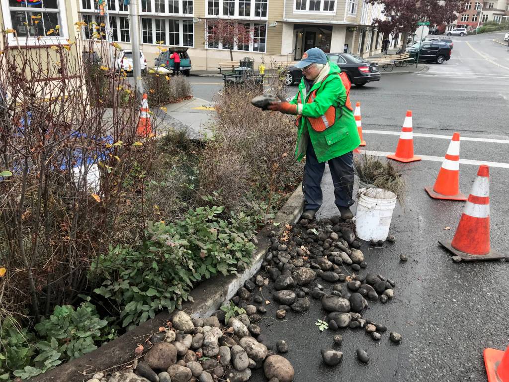 Town employees and volunteer Washington State University Master Gardeners recently completed the first phase of a rejuvenation of the Spring Street rain garden located at the northeast corner of Spring and First Streets. Phase one involved removing 25 five-gallon buckets of silt, removing and cleaning river rock, pulling weeds and unhealthy plants, and cleaning the catch basin. Phase two will include replanting the garden this spring.