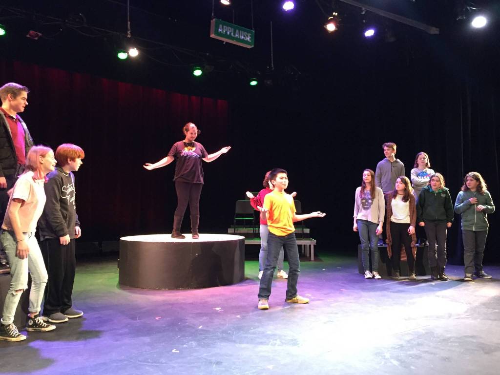 FHMS and Friday Harbor High School Drama Coach and Director Jenni Merritt says that in addition to having fun and making audiences laugh, the production is also about providing more challenges to students to learn additional aspects of life on and off the stage. The middle school cast of 31 and student tech crew also features, for the first time, a student director assisting Merritt. High school sophomore Chiara Power has been acting in several plays and musicals at SJCT since she was 8 years old. And while she did write and direct a short play for a playwrights festival once, this is her first big gig as a director. And according to Jenni, so far…so great: “I was sick last week and when I came back, I asked the cast how it was working with Chiara and they cheered — they’re excited to be learning from a peer,” she said. Chiara says she too is learning a lot. “It’s really important to be communicative with the cast and crew. I knew that as an actor, but this is showing me just how important that is.”