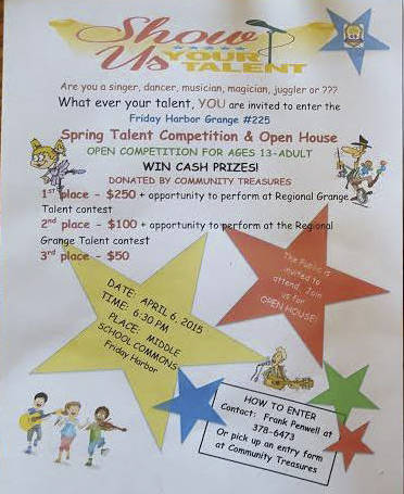 Do you have a talent you want to practice in public, and maybe win a prize? Friday Harbor Grange 225 and Community Treasures are sponsoring a talent contest at the Friday Harbor Middle School on April 5 at 6:30 pm.