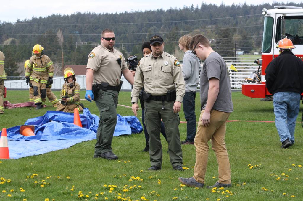 Local firefighters, EMTs and deputies stormed the Friday Harbor High School on April 17 to rescue 10 teens in a two-car accident, while hundreds of students watched.