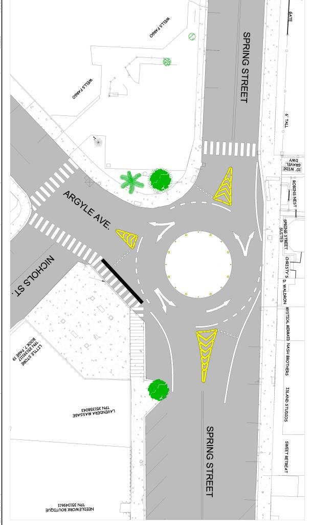 The intersection of Spring Street and Argyle Avenue will be closed to all traffic day and night for four days beginning May 7 for the installation of an intersection roundabout.