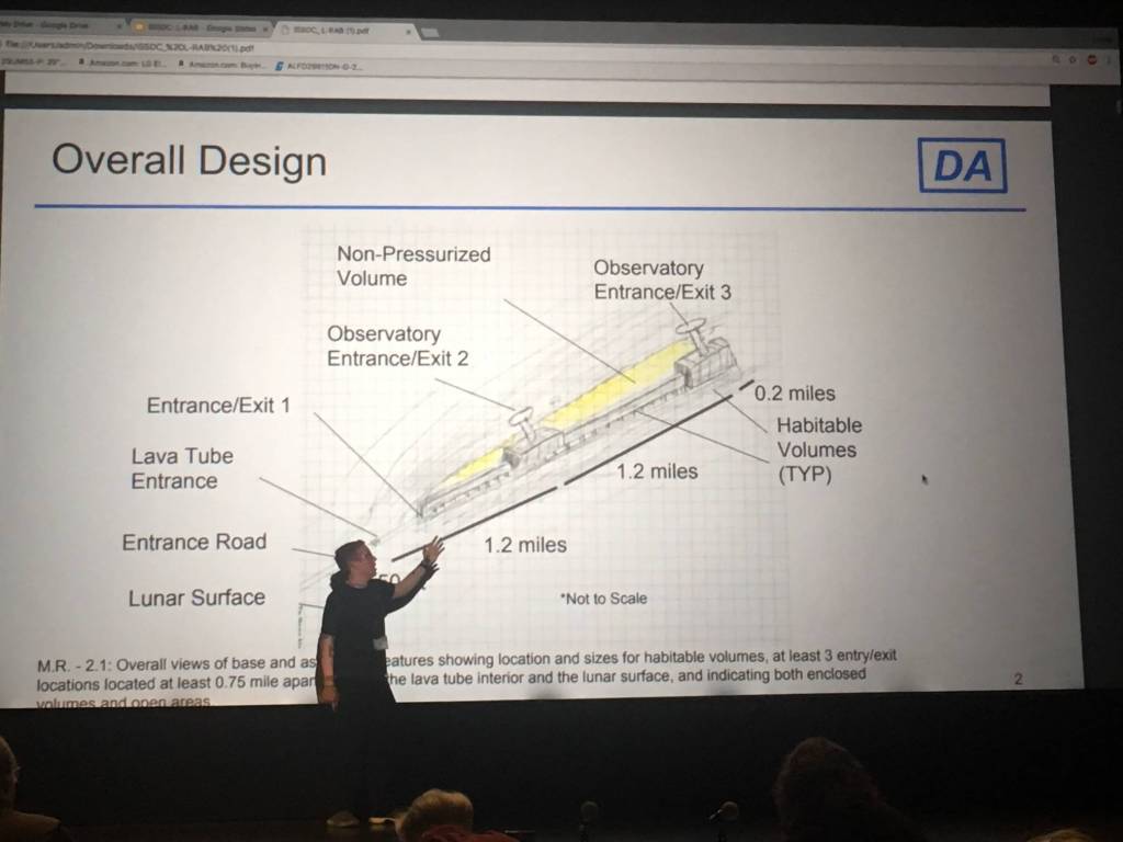At the competition, the FHHS team joined forces with students from Raisbeck Aviation High School to produce a 50-page proposal and create a design brief for judges in about a day. Immediately, FHHS engineers took leadership roles, with Arlo Harold heading the structural design section and Lucy Urbach heading human factors. Joely Loucks and Max Mattox joined Urbach in human factors and Brandon Payne and Evan Foley comprised the automation design department. Working non-stop for 20 hours straight, the team produced a design for a lunar outpost that could safely house up to 400 residents by placing the community in a lunar lava tube. They made a positive impression on the judges by repurposing lightweight shipping containers to create pressurized volumes for community centers and laboratories.