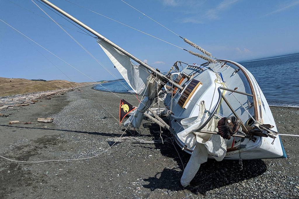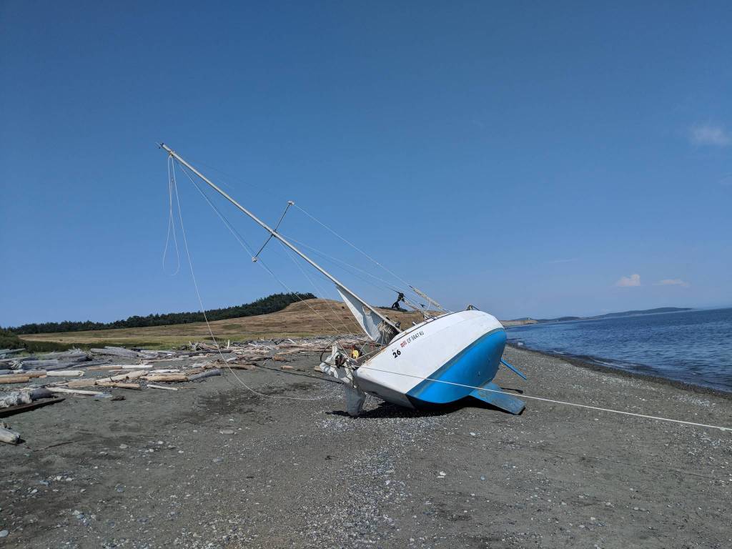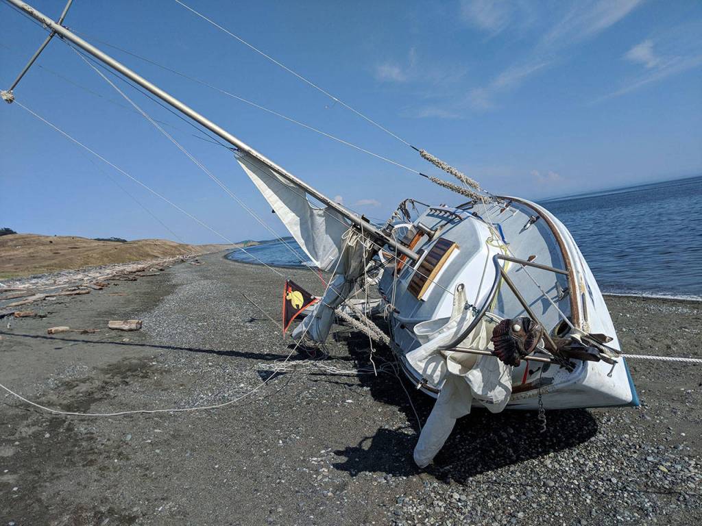 The skipper Jim Edmark was uninjured, according to Reimer, and due to the fact that the boat is a sailing vessel with no engine, no oil was spilled. Edmark is in the Race to Alaska, which runs from Port Townsend, Washington, up to Ketchikan, Alaska, a total of 750 miles. According to Reimer, race rules forbid the use of motors or any support, so Edmark was hoping to use the high tide to get back in the water to remain in the race.