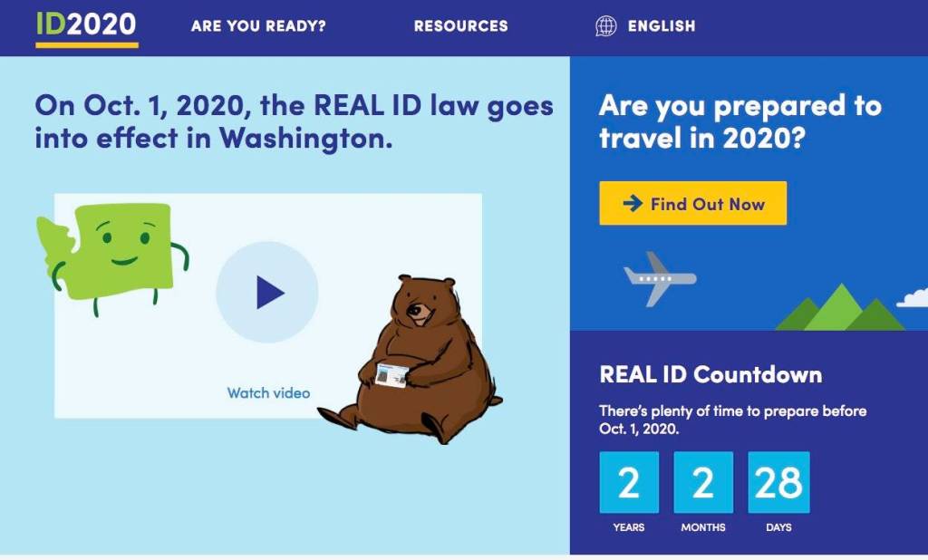 “There is plenty of time to educate yourself on all options and choose the identification that works best for you,” said Pat Kohler, DOL director. “Our ID 2020 campaign was created to help educate Washington residents about the Real ID Act requirements and their options for Real ID-compliant documents if they plan to travel within the United States.”