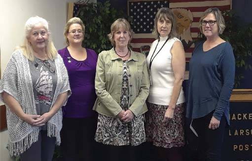 The Ladies Auxiliary of Hackett Larson Post 163 had their annual installation of officers on Sept. 13. The new officers will lead the ladies auxiliary for the 2018-19 activities to support local veterans and soldiers. Join the ladies auxiliary at their meetings, at 5:30 p.m., the second Thursday of each month, in the basement of the American Legion on First Street.