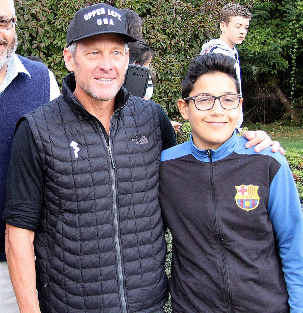 Cyclist Lance Armstrong speaks to Orcas Christian School students