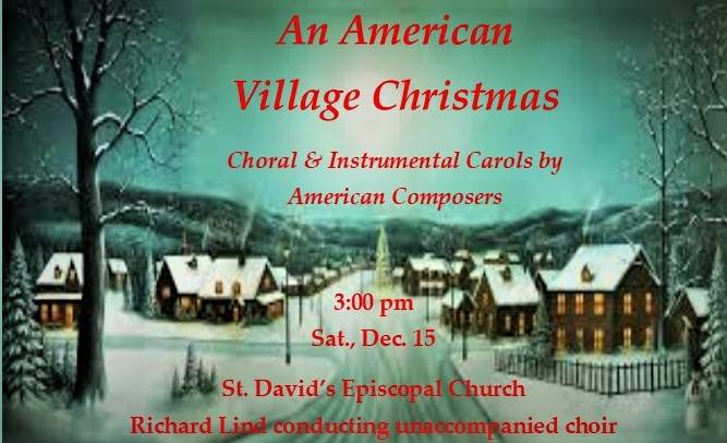 A benefit Christmas concert will be held at 3 p.m., Saturday, Dec. 15, at St. David’s Episcopal Church. The concert, “An American Village Christmas,” will feature Advent and Christmas hymns and anthems by American composers found in “The Sacred Harp,” “The Southern Harmony,” “The Mennonite Singing Book” and “The Christian Harmony,” along with Appalachian melodies and African-American spirituals.