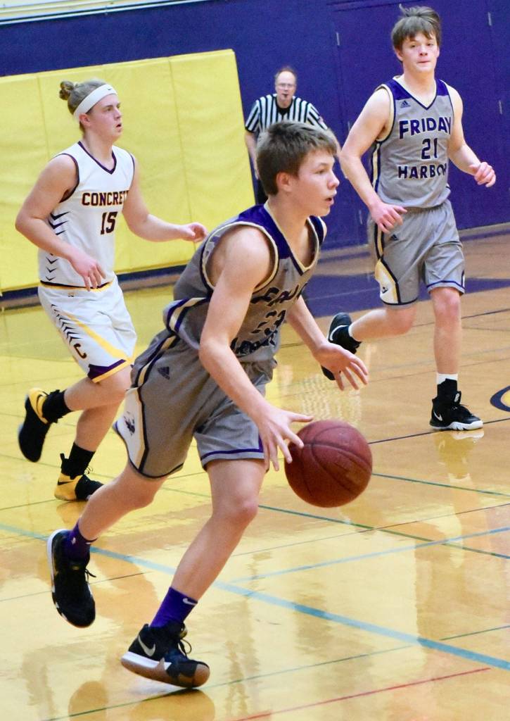 The Friday Harbor Wolverines caged the Concrete Lions with a double win on Friday, Jan. 4. The boys varsity team outscored the Lions, 67-28. The lady Wolverines ran away with a score of 60-12.