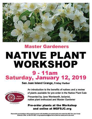 The Master Gardener Foundation of San Juan County will host a native plant workshop from 9-11 a.m., Saturday, Jan. 12 at the San Juan Island Grange in Friday Harbor. The event will include an introduction to the benefits of natives and a review of plants available for pre-order in the native plant sale. Pre-order plants at www.mgfsjc.org.