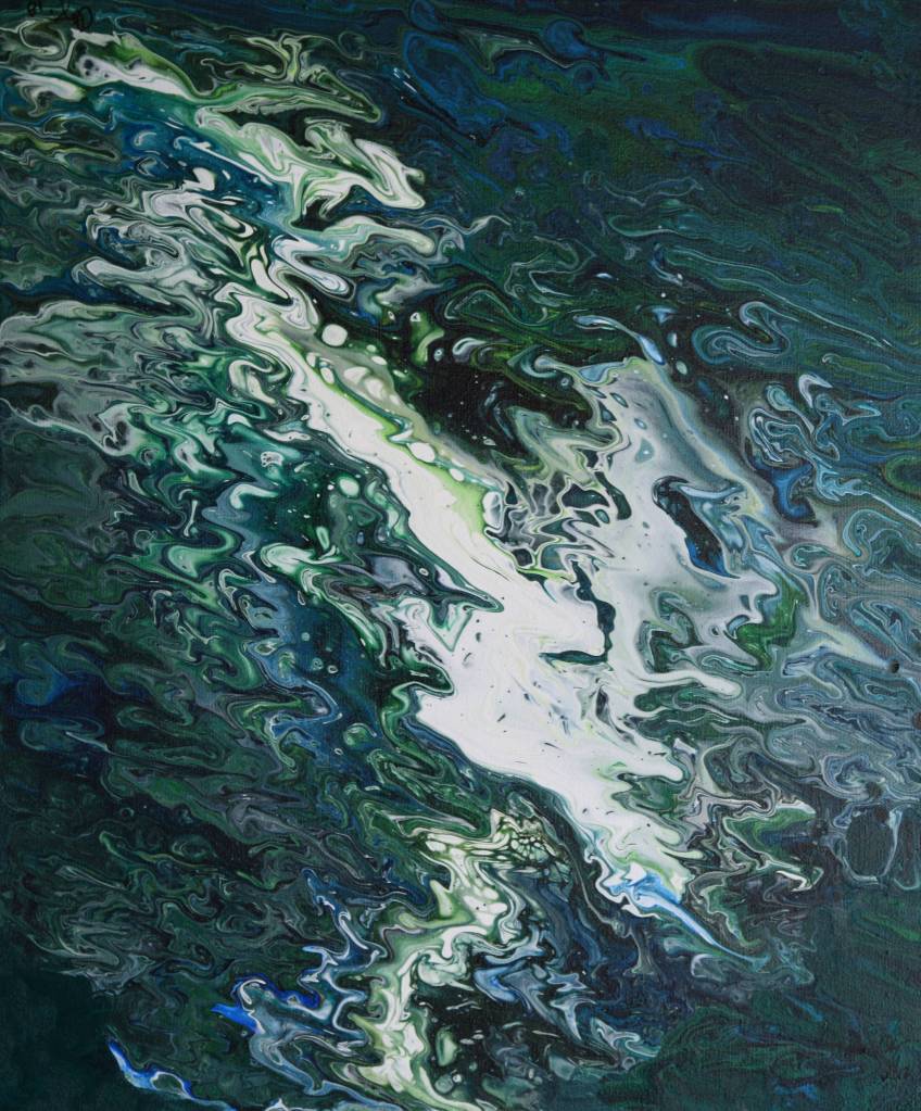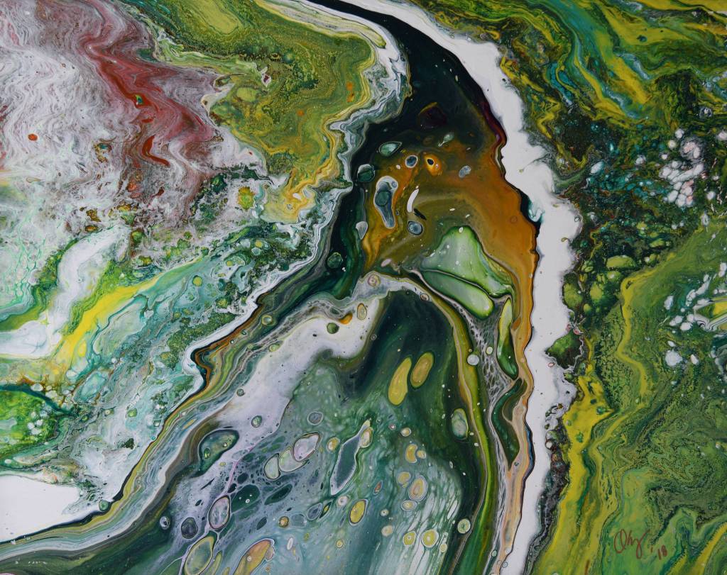 The exhibit consists of photography, drawing, and acrylic painting, including the experimental form known as pour painting. “One of my greatest pleasures in pour painting is the surprise that is inherent in the experimental nature of each piece. In this, it seems to mirror Life,” Breez wrote in a welcoming statement at the show.