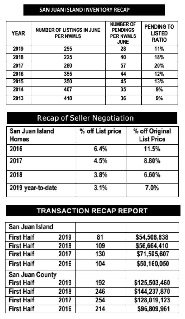 The second quarter results which complete the first half of the year for San Juan Island were similar to the first quarter. Per the NWMLS, the dollar volume on San Juan Island was $54,508,838 with a total of 81 transactions. The numbers reflect a 4% decrease in dollar volume and a 26% decrease in the number of transactions as compared to the same period in 2018. However, it was a slight improvement over the period of 2017 to 2018 when the volume decrease for the same period was 22% and the decrease for the number of transactions was 18%. For San Juan County, the total dollar volume was $125,503,460 with a total of 192 transactions. The County’s decrease in volume was 13% with a 22% decrease in the number of transactions.
