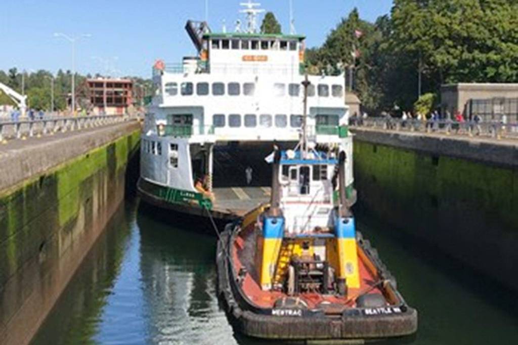 Ferry fans lined Seattle’s Lake Washington Ship Canal Monday morning to witness an unusual sight as one of our iconic ferries sailed through! Tugboats guided the 144-car Super-class Elwha from our Eagle Harbor Maintenance Facility on Bainbridge Island to the Lake Union Drydock Company where it will undergo repairs on its deck steel. During its journey, the vessel passed through the Hiram M. Chittenden Locks, then under the Ballard, Fremont and Aurora bridges, before entering Lake Union.