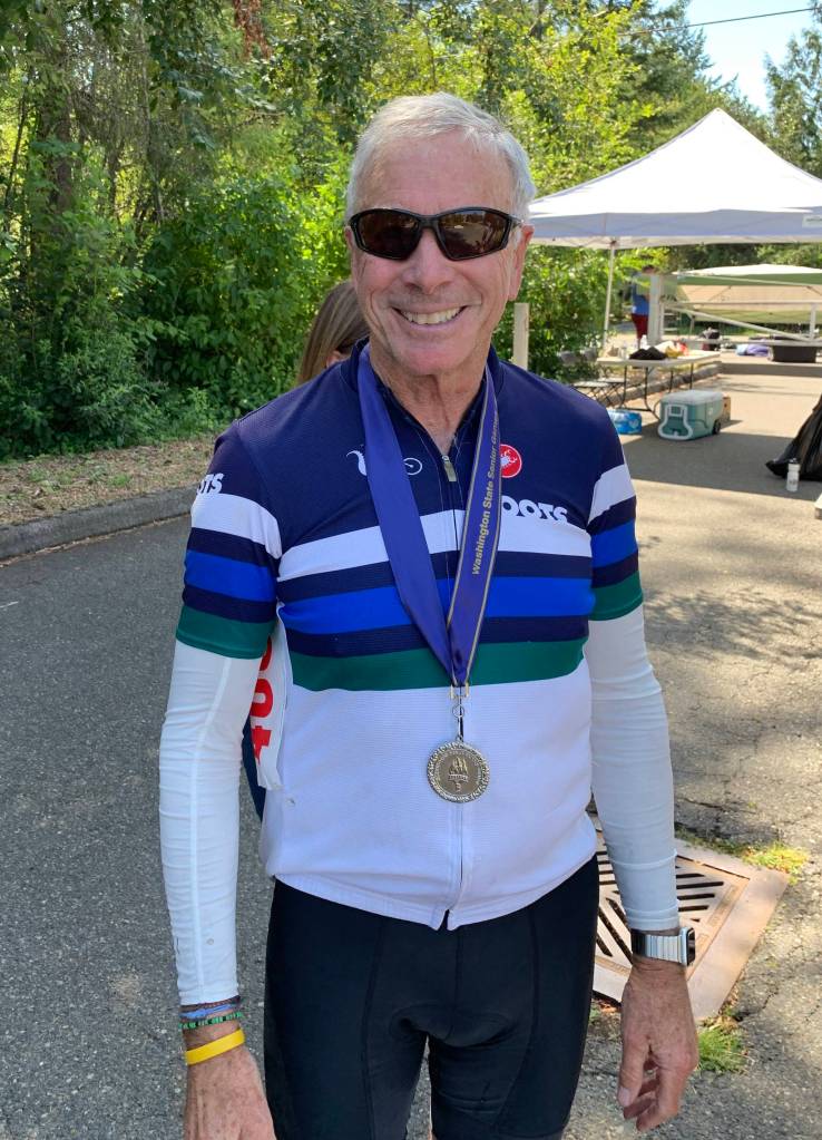 With a finishing score of 1:21:13, he won the silver in bicycling during the 40K road race, age bracket 75-79, during the Washington State Senior Games that took place on July 28 in Olympia, Washington.