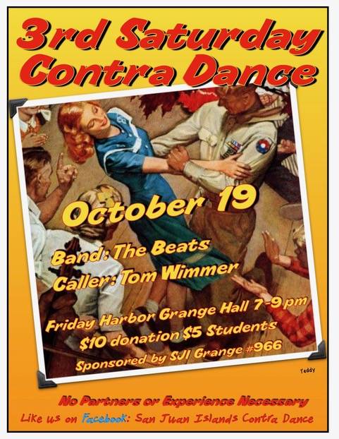 The monthly third Saturday contra dance will be held Saturday, Oct. 19 from 7-9 p.m. at the Grange Hall in Friday Harbor.